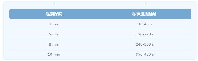 依据标准玻璃加热容量,每1mm厚的玻璃加热时间是30-45s,即5mm玻璃的标准加热时间150-220s,8mm玻璃的标准加热时间是240-360s,10mm玻璃的标准加热时间是350-450s。